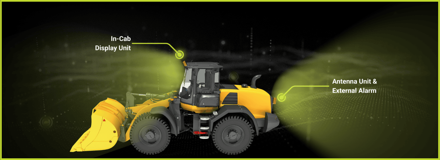 The system includes two antennas, an in-cab display, external alarm, and mounting hardware, and is designed to deliver flexible, expanded detection coverage for complex equipment layouts and high-risk jobsite environments.