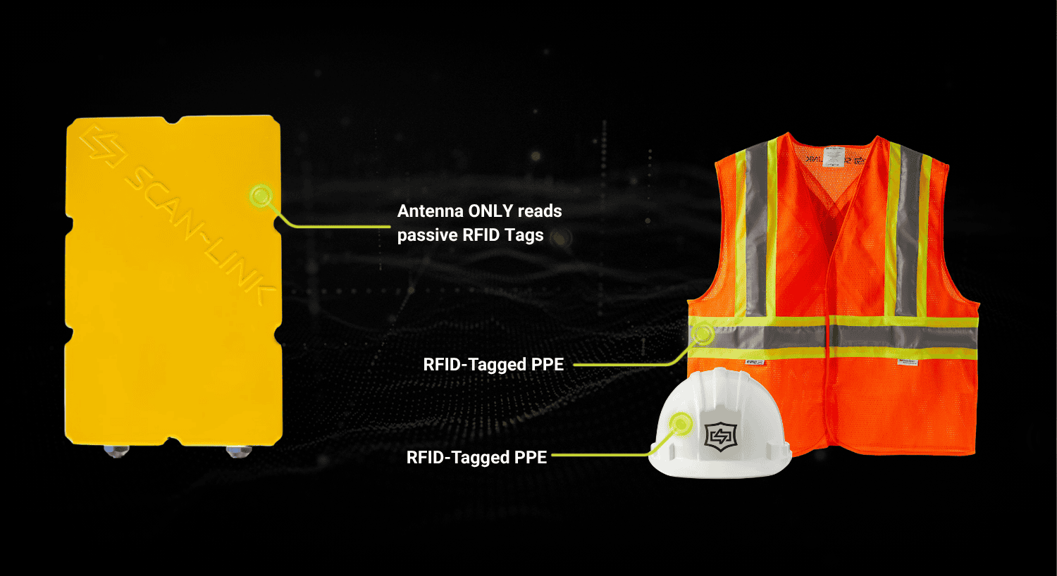 - Ground Worker: Passive RFID tags are embedded in standard safety PPE, such as high-visibility vests, and passive RFID tags are affixed onto existing hard hats. These tags are passive, meaning they require no batteries or maintenance, and remain dormant until within range of a SCAN~LINK antenna mounted on mobile equipment.